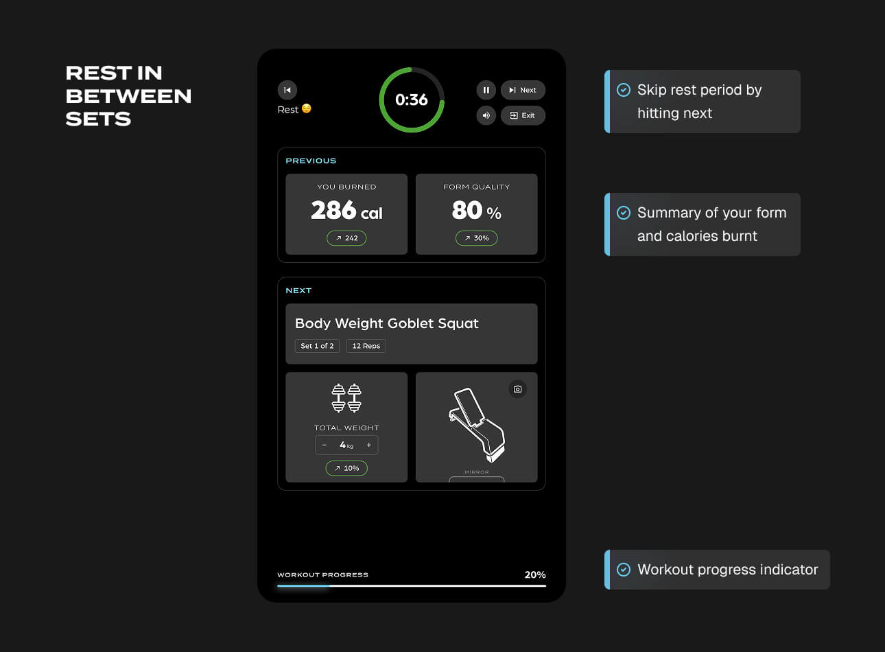 Before each workout, the camera scans to ensure users are positioned correctly for form tracking. This simple step solved a major anxiety point-users knew the AI could "see" them properly.